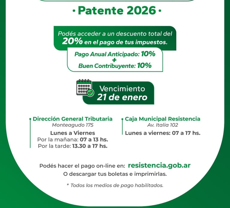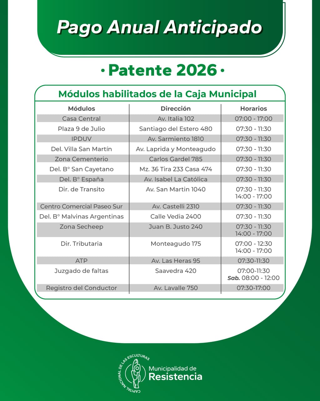 [09/01/2026] - La Municipalidad de Resistencia informa a los contribuyentes la habilitación del pago anual anticipado de patentes vehiculares, correspondientes al corriente año. También anunció beneficios y facilidades para abonar este tributo.