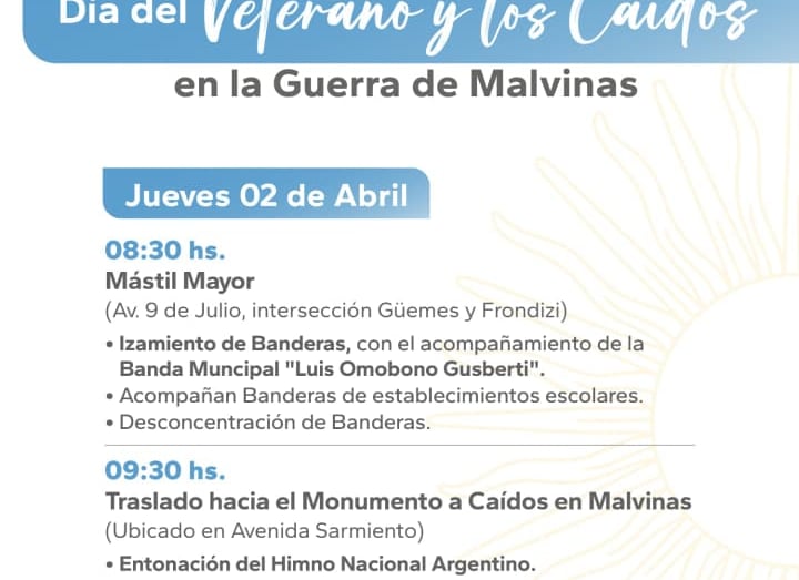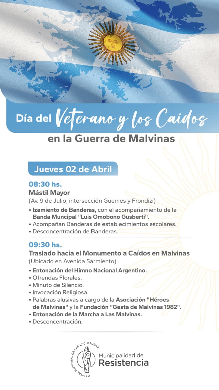 [01/04/2026] - La Municipalidad de Resistencia rememora el Día de los Veteranos y los Caídos en la Guerra de Malvinas este jueves 2 de abril, comenzando con el izamiento del Pabellón Nacional en el Mástil Mayor, ubicado en la intersección de avenida 9 de Julio y calle Güemes, a las 8.30 horas.