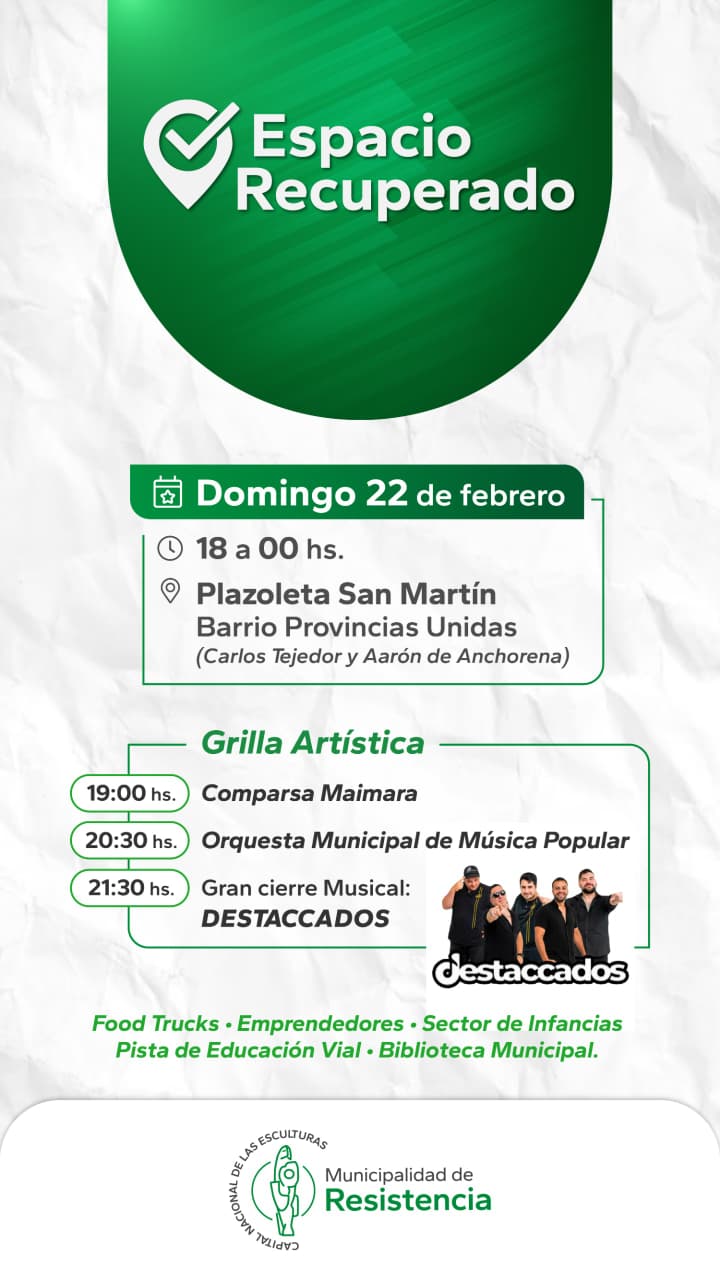 [22/02/2026] - La Municipalidad de Resistencia invita a los vecinos al gran festival a realizarse ésta tarde en la plazoleta “General San Martín” del barrio Provincias Unidas, ubicada en la intersección de Carlos Tejedor y Aarón de Anchorena, donde serán presentadas las refacciones de este espacio recuperado por la gestión Nikisch.